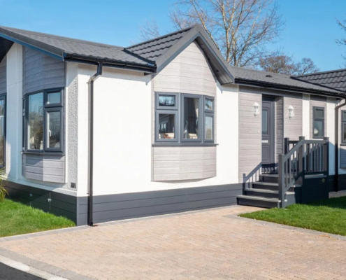 This brand new, modern-furnished (40’x20′) park home has a spacious kitchen, living and dining room, two double bedrooms, an en suite and a bathroom. The home has a fenced garden with a metal 5’x7′ shed, and allocated parking.