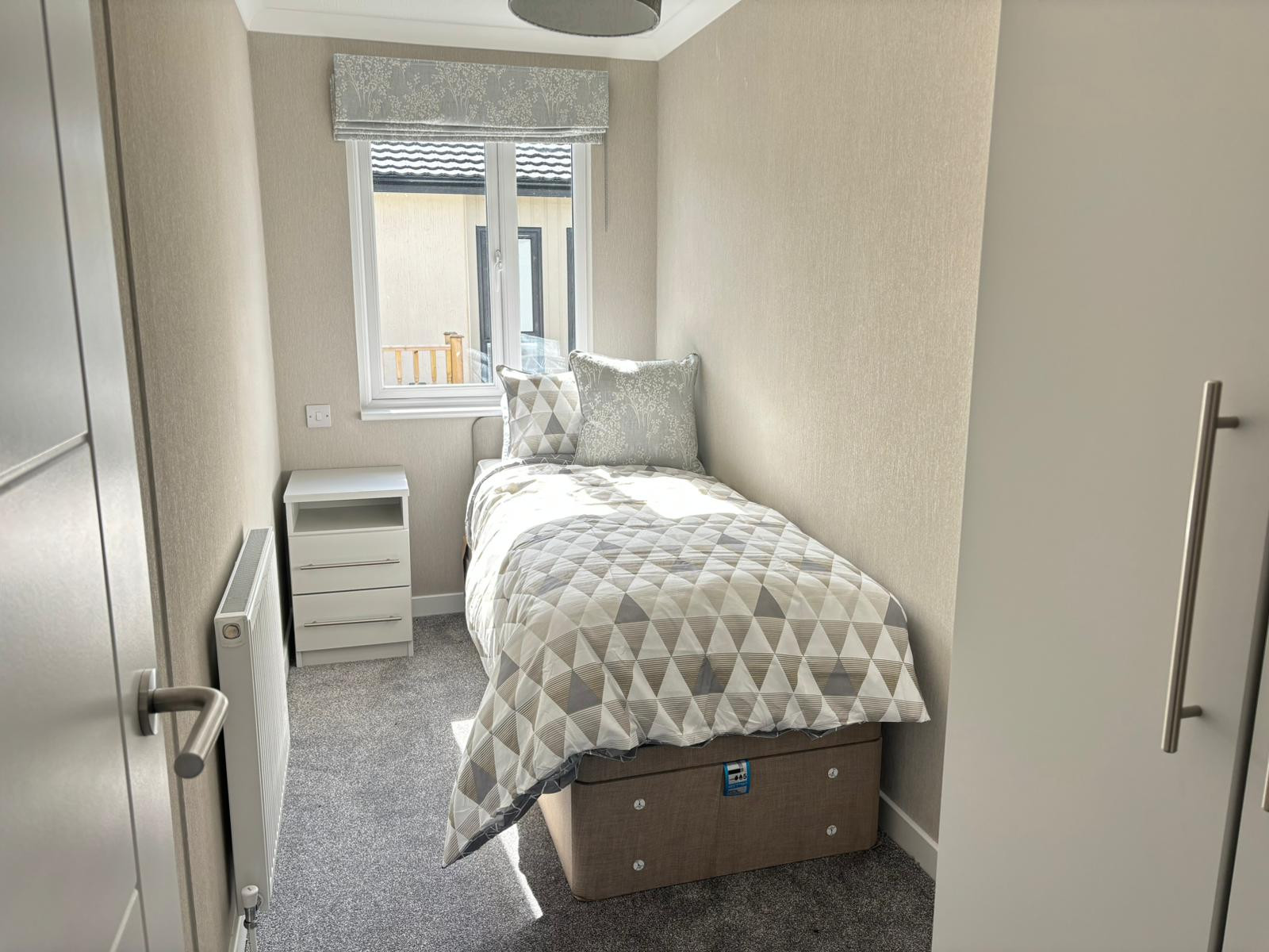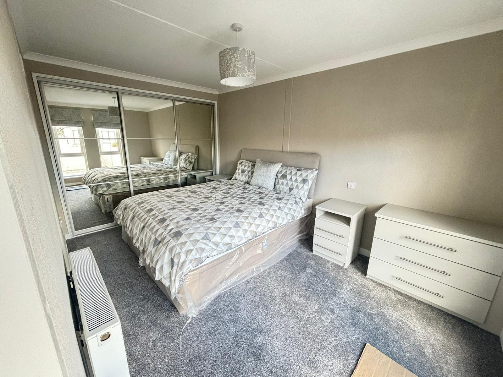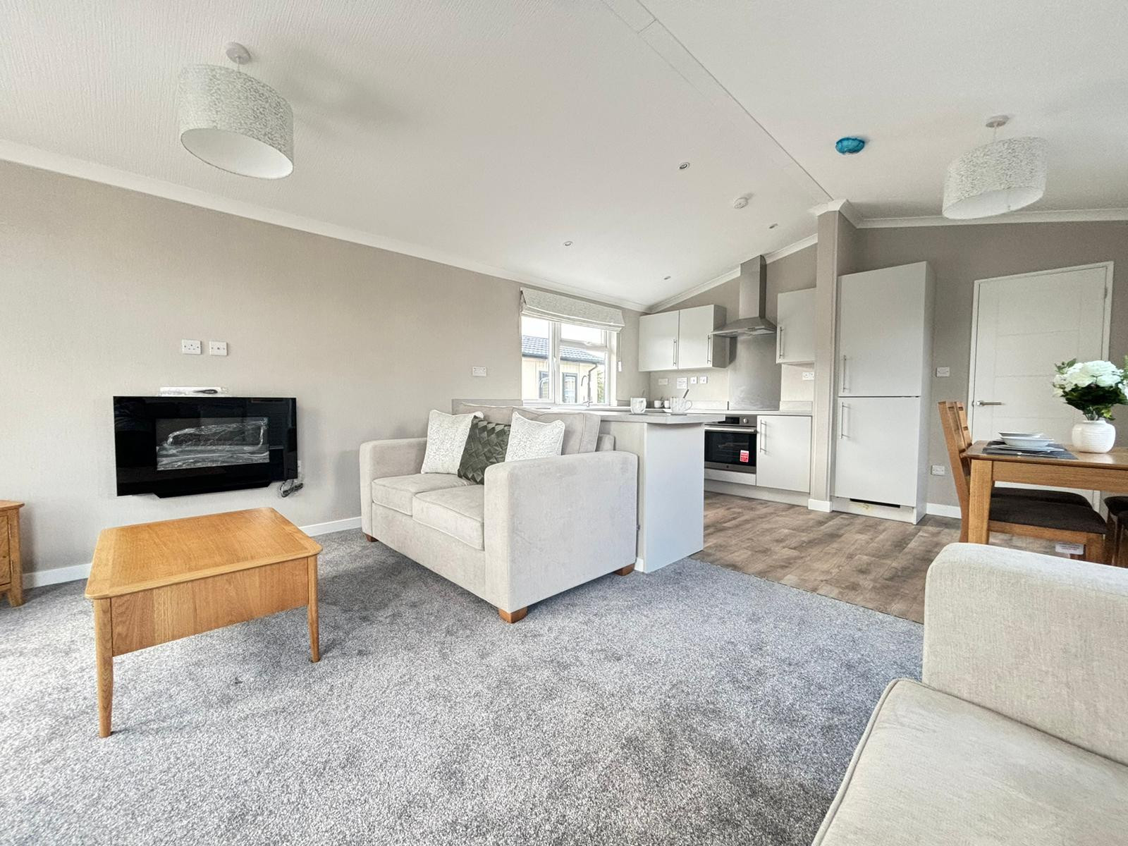 This brand-new, modern-furnished Omar Newmarket (42'x16') luxury park home is perfect for those looking for a detached, easy-to-maintain, bungalow-style property. Built to a high specification, the home has an open plan kitchen, living and dining area, with large windows to allow in lots of natural light. There is a double master bedroom with fitted wardrobes, a single second bedroom, and a bathroom. The landscaped exterior boasts a garden area and a driveway.