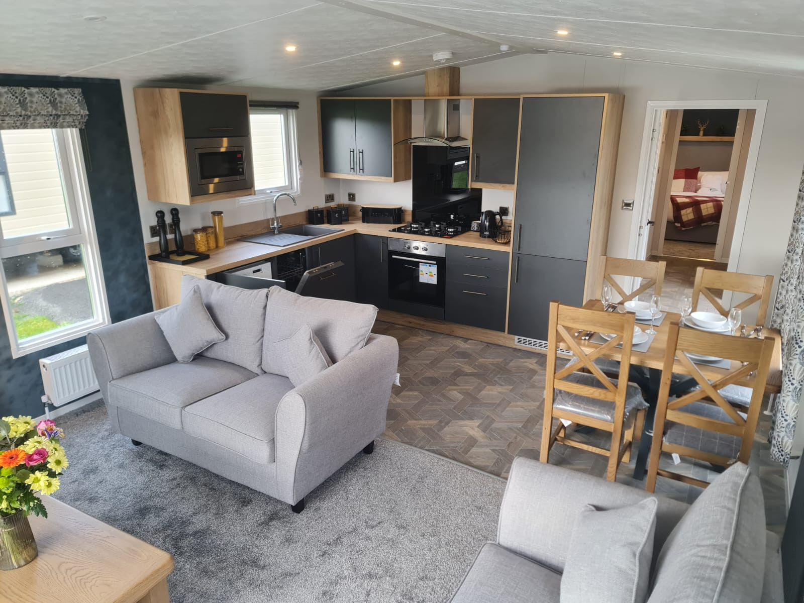 This brand new, modern-furnished luxury park home (42'x14') is perfect if you are looking for a detached, easy to maintain, bungalow-style retirement property. This home features a sleek, modern kitchen, and a comfortable living room with doors leading to decking. There are two bedrooms and two bathrooms, large windows and modern furniture.