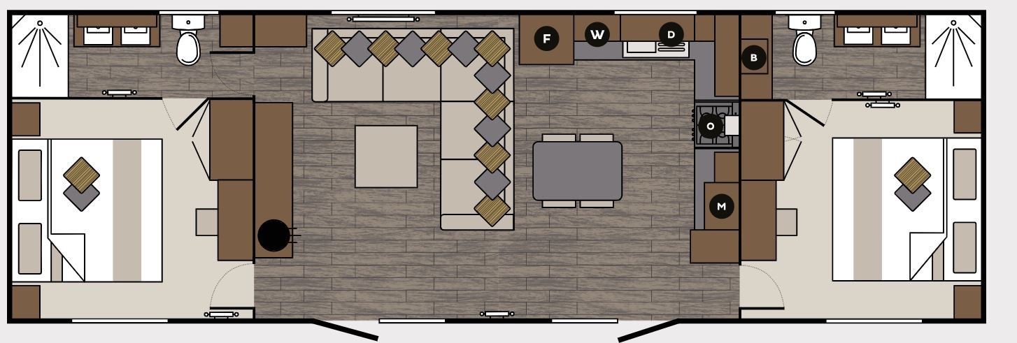This brand new, modern-furnished Carnaby Langham (41'x13') luxury lodge is perfect for those looking for a detached, easy to maintain, bungalow-style property. The lodge has an open plan kitchen, dining and living room, two bedrooms, an en suite and a bathroom.