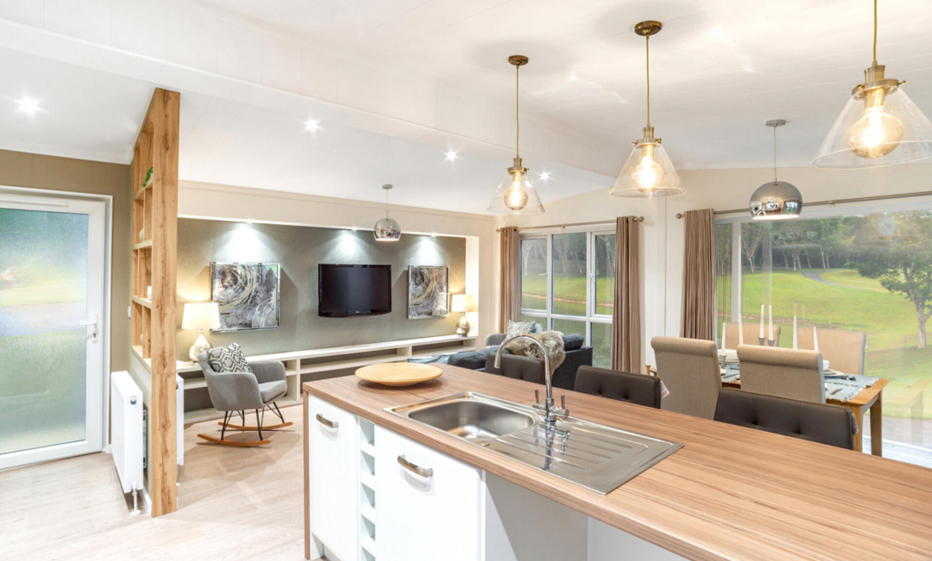 This brand new, modern-furnished Tingdene Harrington (40'x20') luxury park home is perfect for those looking for a detached, easy to maintain, bungalow style residential property. The home features an open plan kitchen, dining and living space, two bedrooms and two bathrooms. This home is on a premium plot offering uninterrupted views of the Moray countryside.
