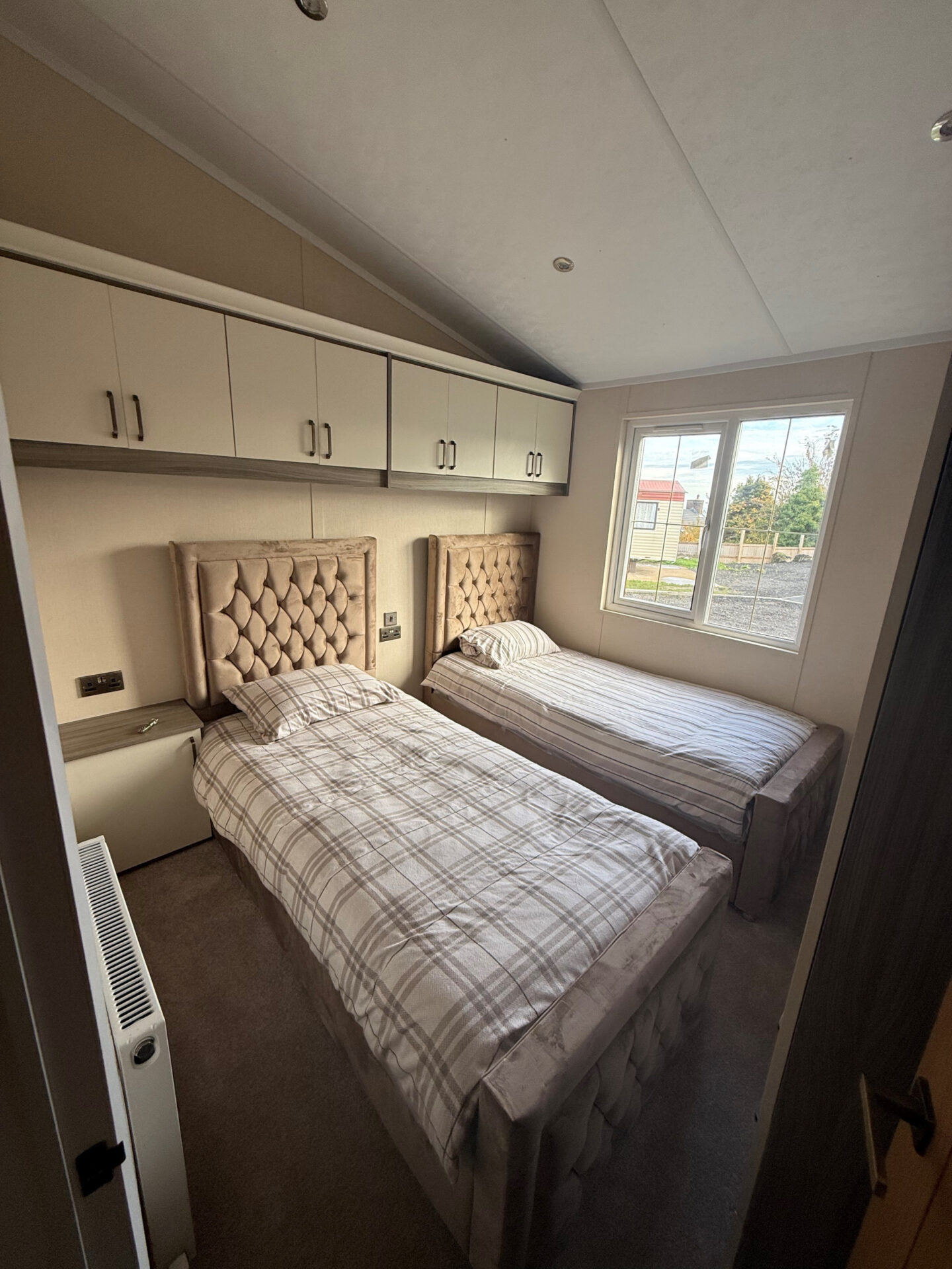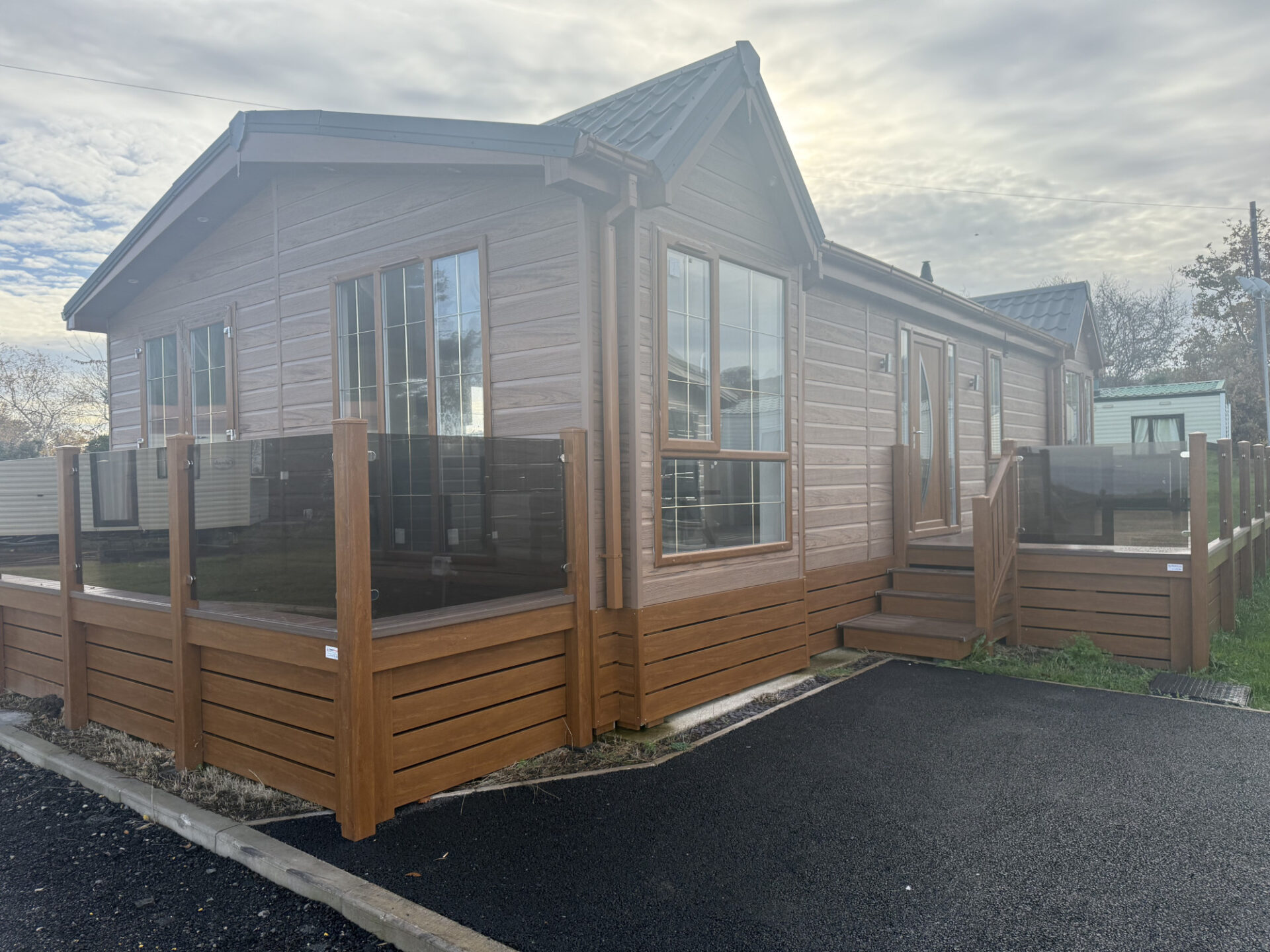 This brand-new, modern-furnished luxury park home is perfect for those looking for a detached, easy-to-maintain, bungalow-style property. The home has an open plan kitchen, dining and living room. The kitchen has a large cooker, plenty of storage and an island to add extra surface space. The living area has an electric fireplace and double doors leading to a decking area that overlooks the park. There are two bedrooms, the master has a walk in wardrobe and an en suite. The lodge-style home is fully furnished with stylish beds, plush sofas and modern touches.