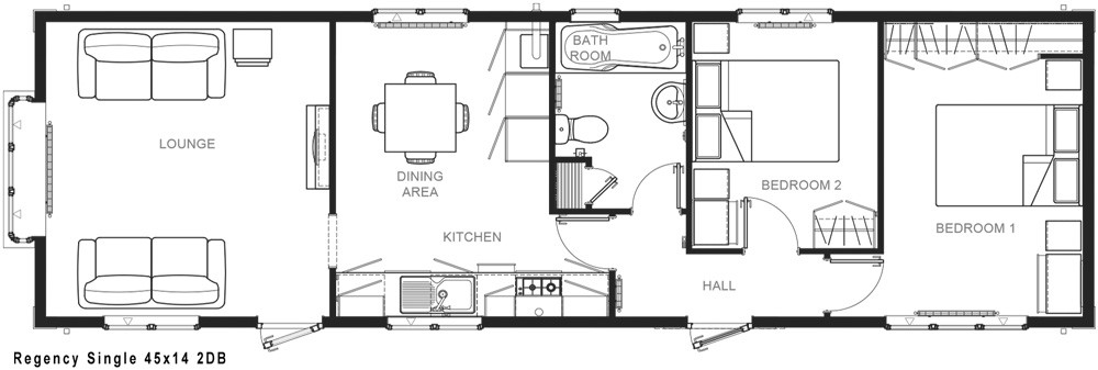 This brand new, modern-furnished Omar Regency (40'x14') park home is perfect for those looking for a detached, easy to maintain, bungalow-style property. The home has a kitchen, living and dining room, two bedrooms, and a bathroom