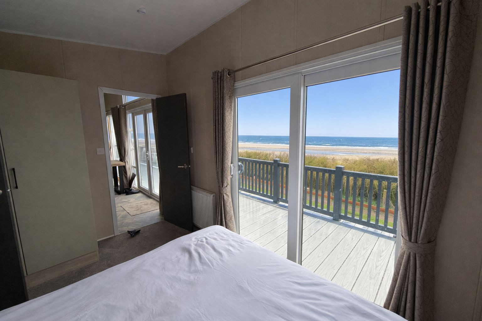 This brand-new, modern-furnished Delta Athena (42'x14') luxury lodge is perfect for those looking for a detached, easy-to-maintain, bungalow-style property. This lodge is a beach front home, with stunning uninterrupted beach views from the living room, decking and bedrooms. The lodge has a modern, spacious kitchen with integrated appliances, a comfortable living and dining area, one double bedroom and one twin bedroom.