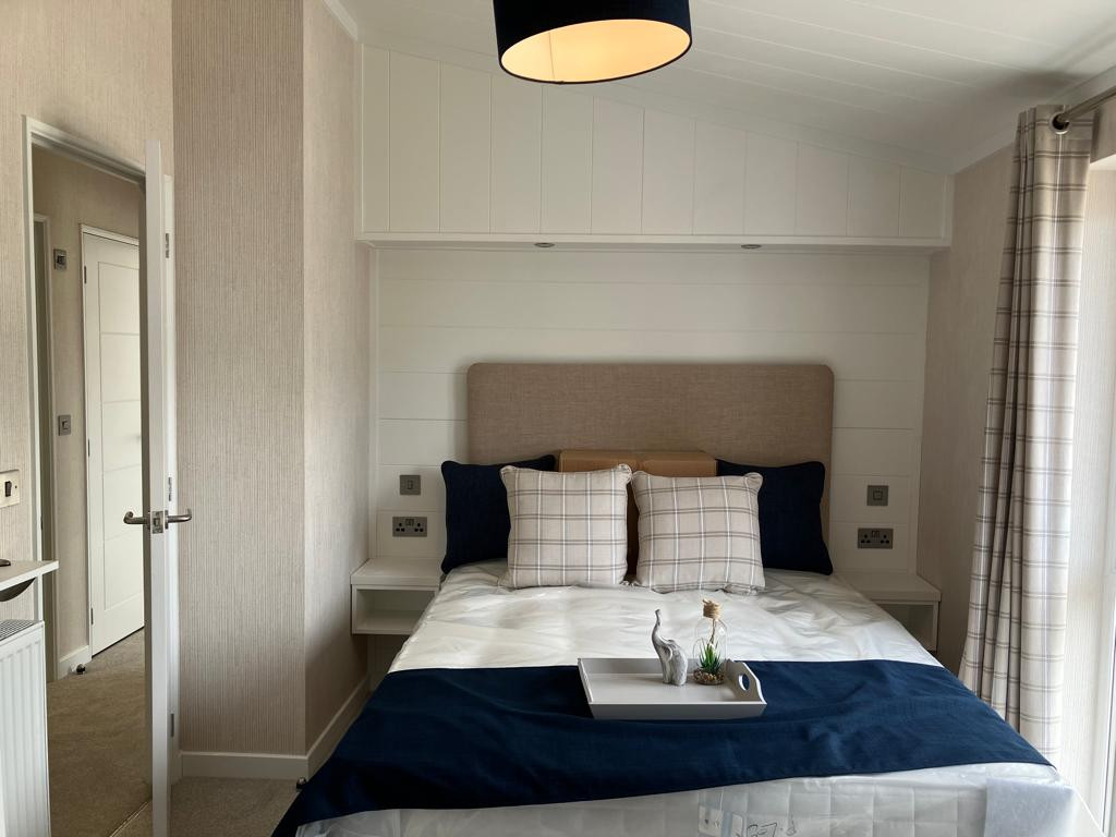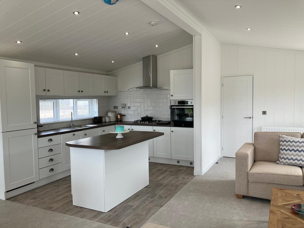 This brand new, modern-furnished Omar Alderney (45'x20') luxury park home is perfect for those looking for a detached, easy to maintain, bungalow-style property. The home features and open plan living space with a spacious kitchen with integrated appliances, an island and a dining area. The living area features an electric fireplace and large windows and French doors leading to the patio. The master bedroom has an en suite and and there is a second double bedroom and a bathroom.