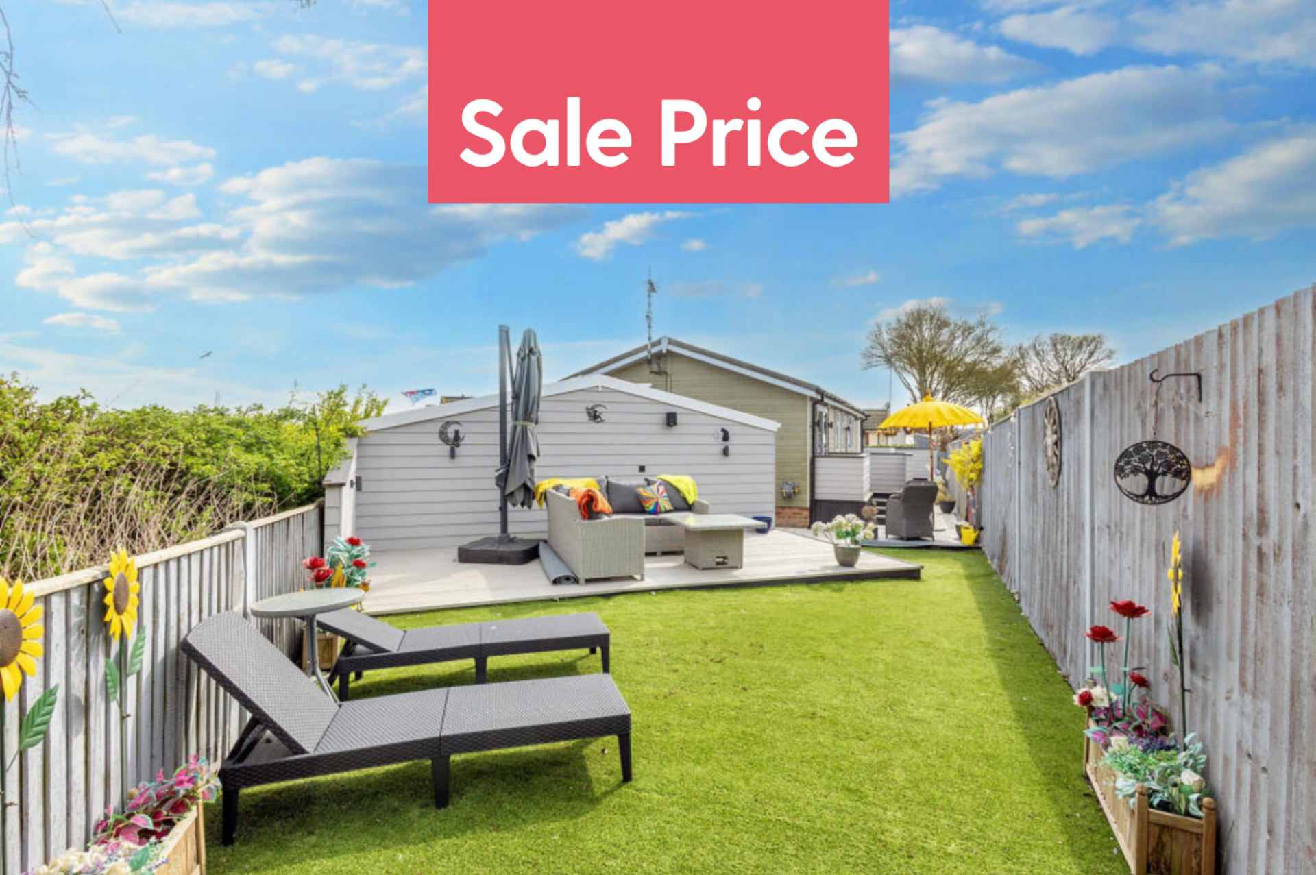 This is a well presented three bedroom detached park home bungalow located on a corner plot with a large garden. The home has a new kitchen and appliances, it is a very smart home with top specifications. The open plan kitchen, dining and living area enjoys large windows and a vaulted ceiling. The master bedroom features French doors leading to the garden, fitted wardrobes and an en suite. There are two further bedrooms and a bathroom. There is air conditioning in the living room and bedrooms. The spacious and private garden area includes a large decking, and a patio with a shed. There is a large storage shed and large driveway.