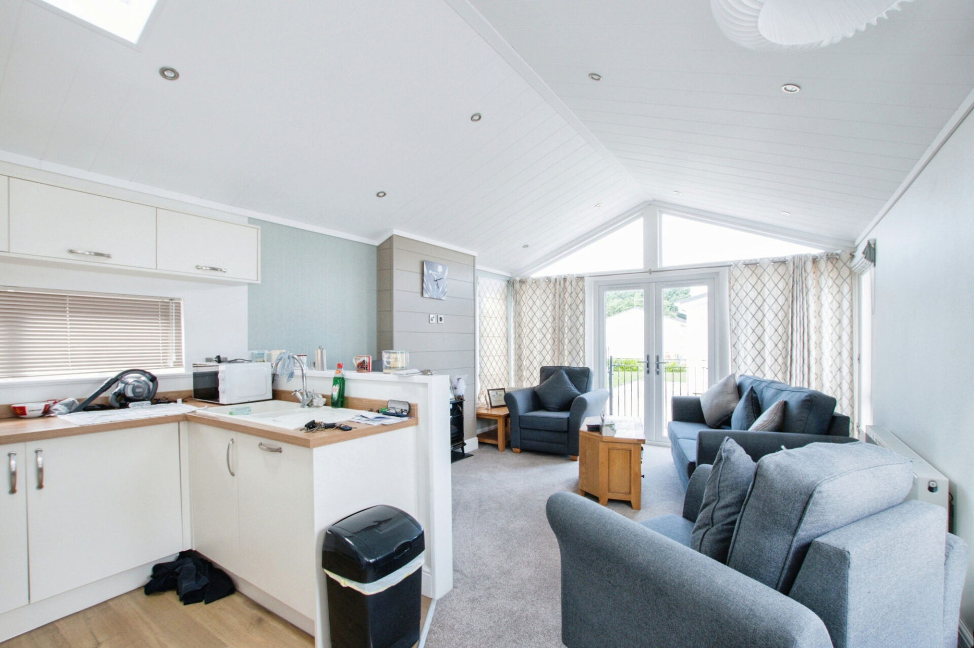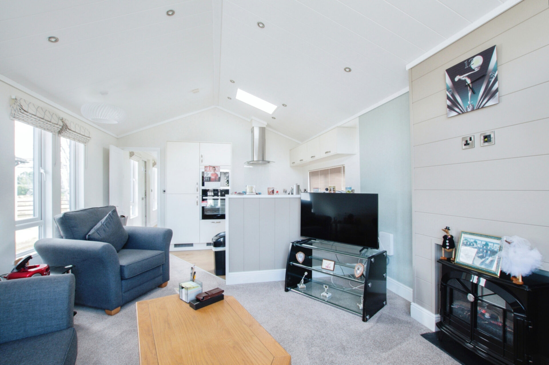 This modern, well maintained park home (40'x14') is located of a gated development which backs onto the country park. The home has an open plan kitchen and living room, two bedrooms, an en suite and a bathroom. The exterior include a driveway and an easy to maintain garden space.