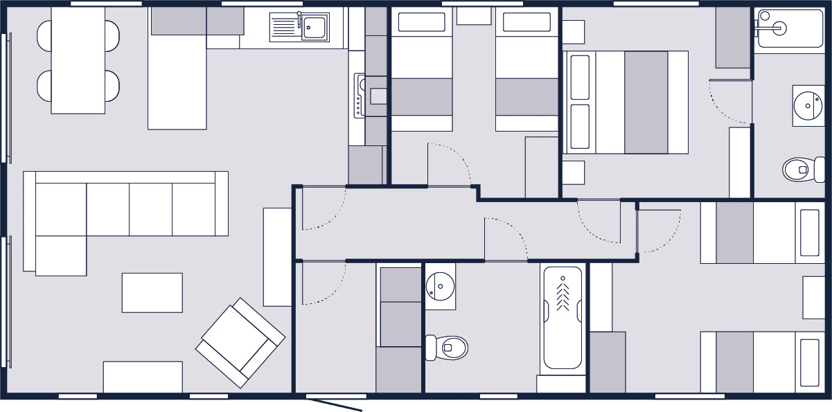 This brand new, modern-furnished Victory (40'x20') luxury lodge is perfect for those looking for a detached, easy to maintain, bungalow-style property. The lodge has an open plan kitchen, dining and living area with large windows, one double bedroom with an en suite, and two twin bedrooms and a bathroom.